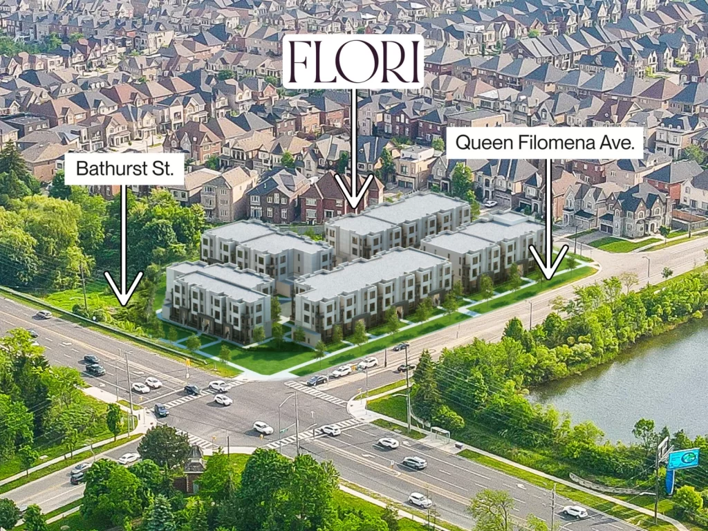 Flori Towns is a boutique collection of ~104 modern 3‑bedroom townhomes, being developed by Treasure Hill Homes, located at Bathurst & Queen Filomena in Vaughan
